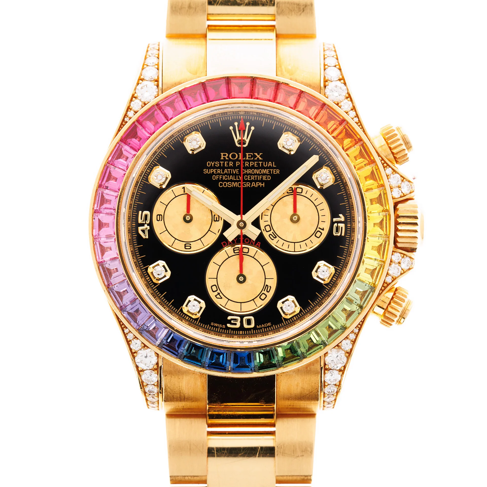 The first thing that strikes you about the replica Daytona Rainbow 116598 is its sheer visual presence. The bezel features multicoloured stones arranged in a gradient, designed to mimic sapphires, rubies, and other gemstones. From a distance, the effect is surprisingly convincing. Even close up, the colours pop without looking overly artificial.